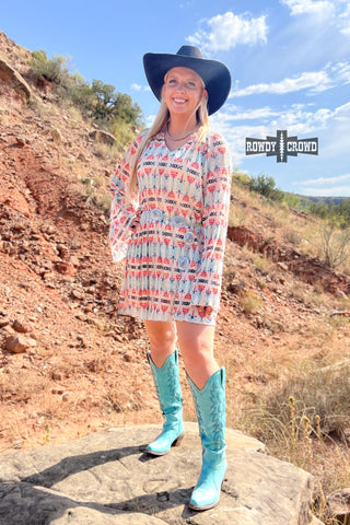 Are you ready to have some fun in our Darlene Dress! This stylish dress features a flawless Aztec print that will make you stand out from the crowd. With long sleeves and a convenient belt, it's not only fashionable but also comfortable. A must-have for any fashion-forward individual!