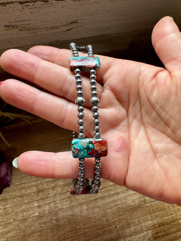 This double strand choker-style necklace measures 13 inches with an extender and is crafted with 4mm and 6mm sterling silver pearls. It features stunning rectangle variscite PINK beads with rich, earthy tones. Though it may look compact when hanging, it lays beautifully on the neck once worn. Finished with a sterling silver lobster clasp and extender. Limited edition – only a few were made.